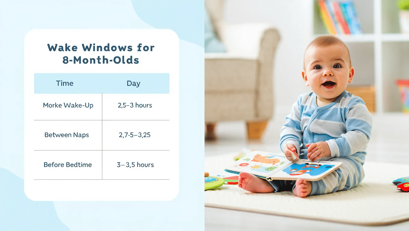 At 8 months of age, babies typically need specific wake windows to support their 2-nap sleep schedule. Most 8-month-olds do best with wake windows lasting between 2.5 to 3.5 hours between sleeps.