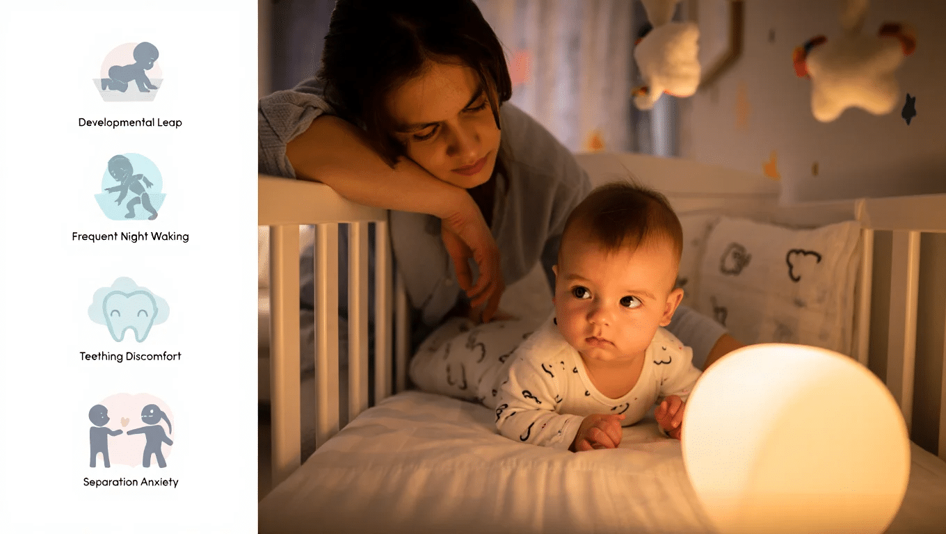 Sleep regressions happen when babies who were sleeping well suddenly start waking up more often or refusing naps. This usually occurs around 8-10 months as babies develop new skills like crawling or pulling up.