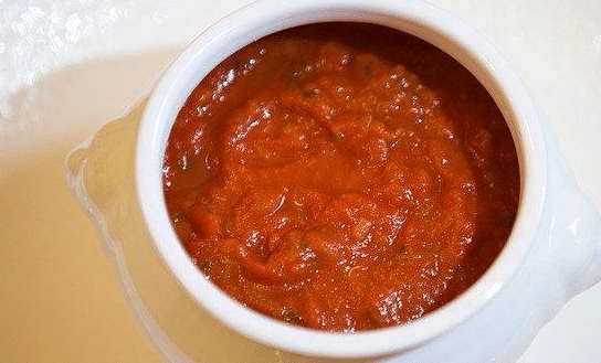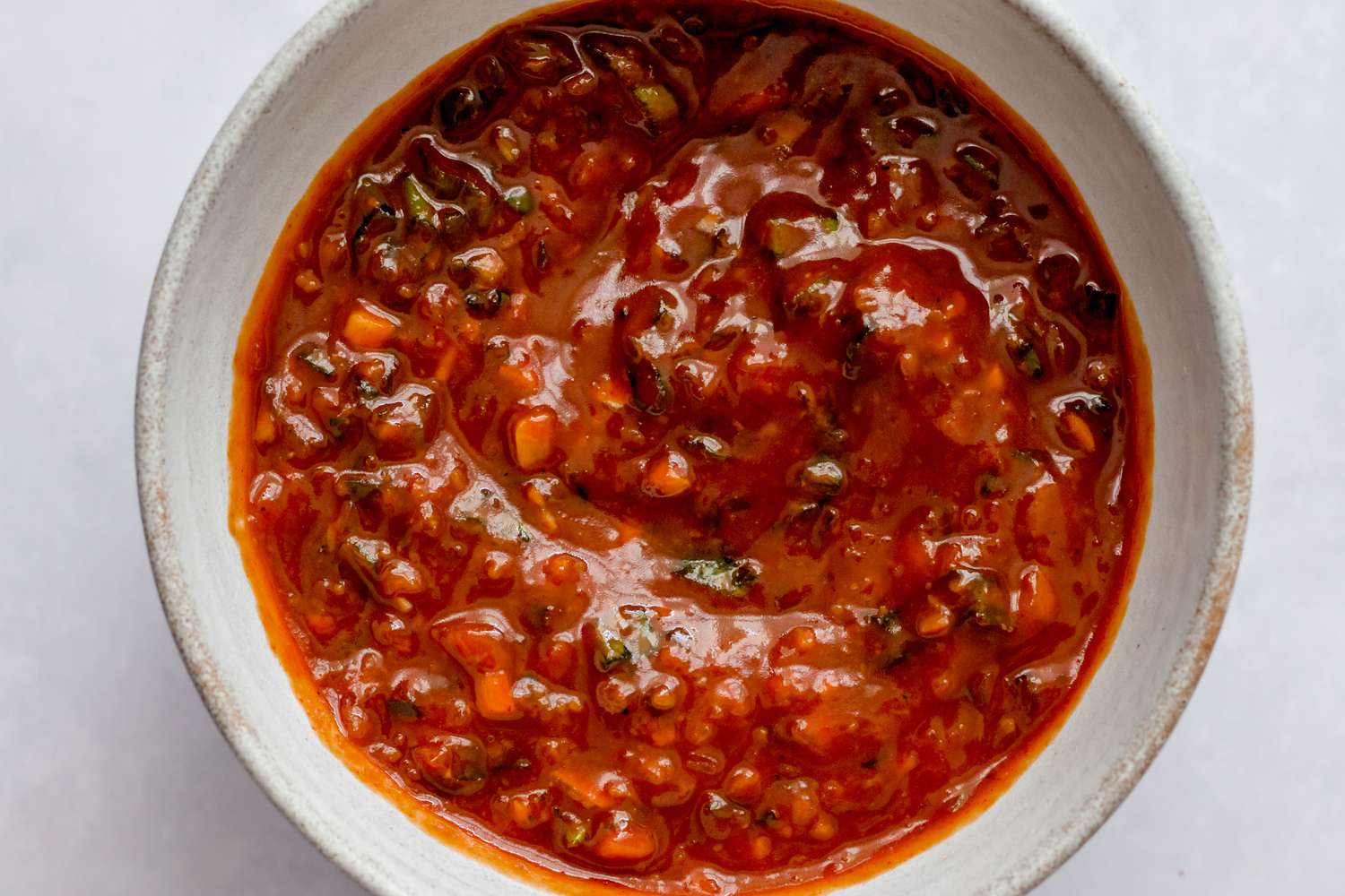 The sauce has a thick, slightly chunky texture and a deep red color.
