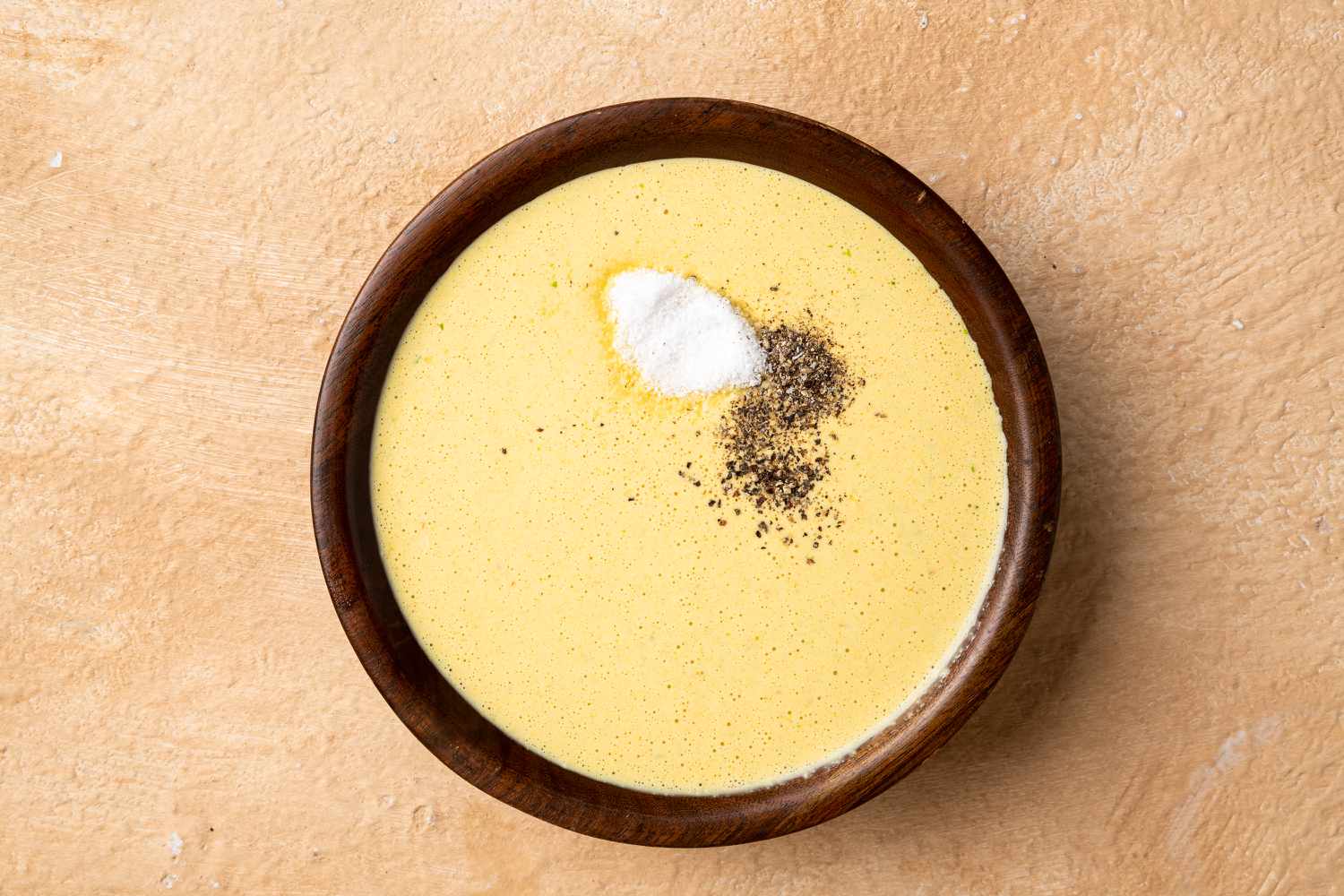 The ingredients are whisked together until emulsified, creating a thin, yellowish-green sauce with a glossy sheen.