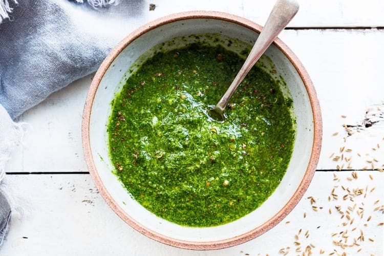 It is made by blending fresh herbs (usually cilantro and parsley), garlic, lemon juice, olive oil, and spices like cumin, coriander, and paprika.