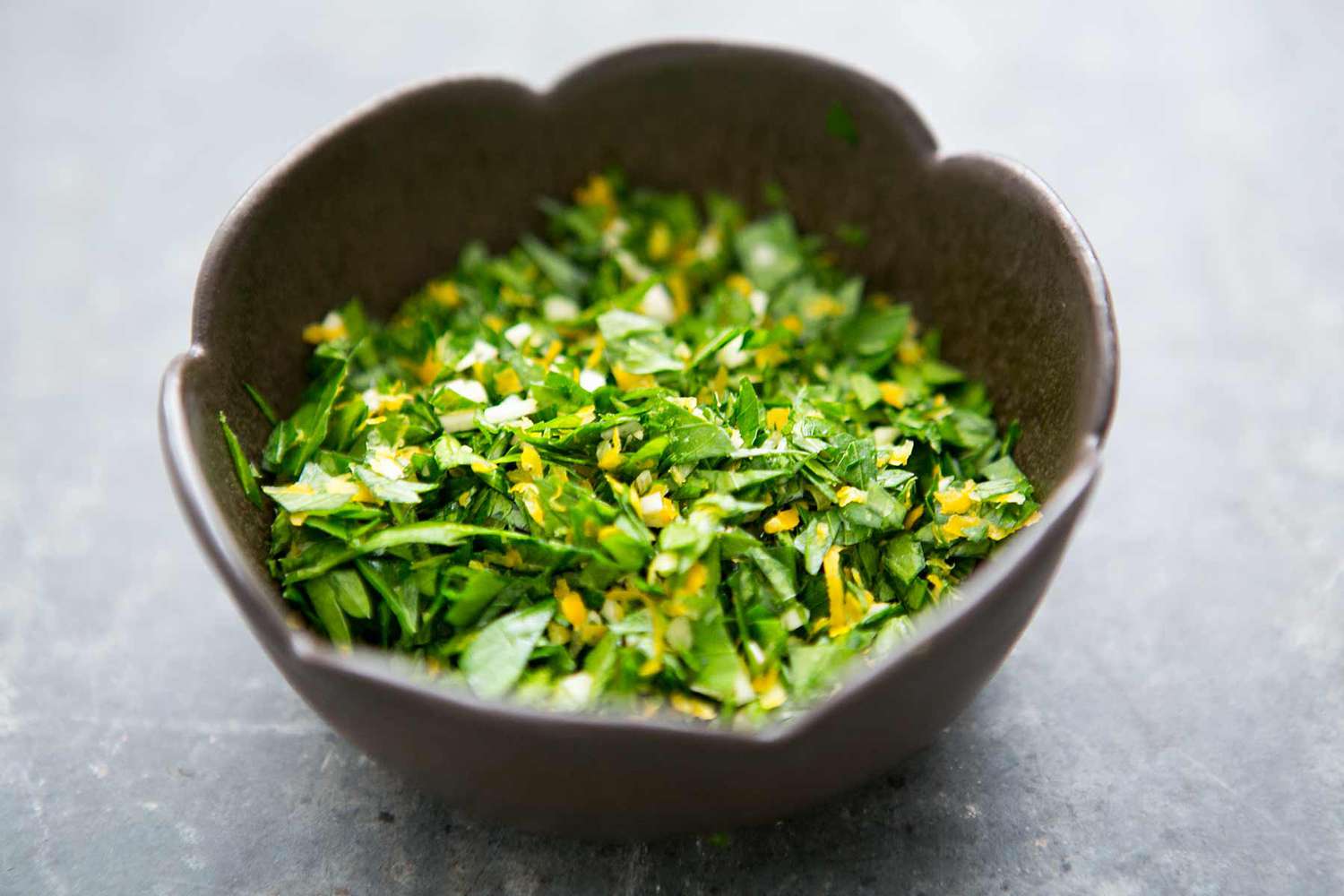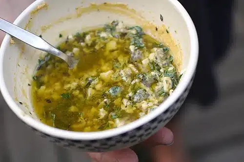 It is made by finely chopping fresh parsley, garlic, oregano, and red chili flakes, then mixing them with olive oil and vinegar. The result is a tangy, herbaceous sauce with a slight kick from the chili flakes.