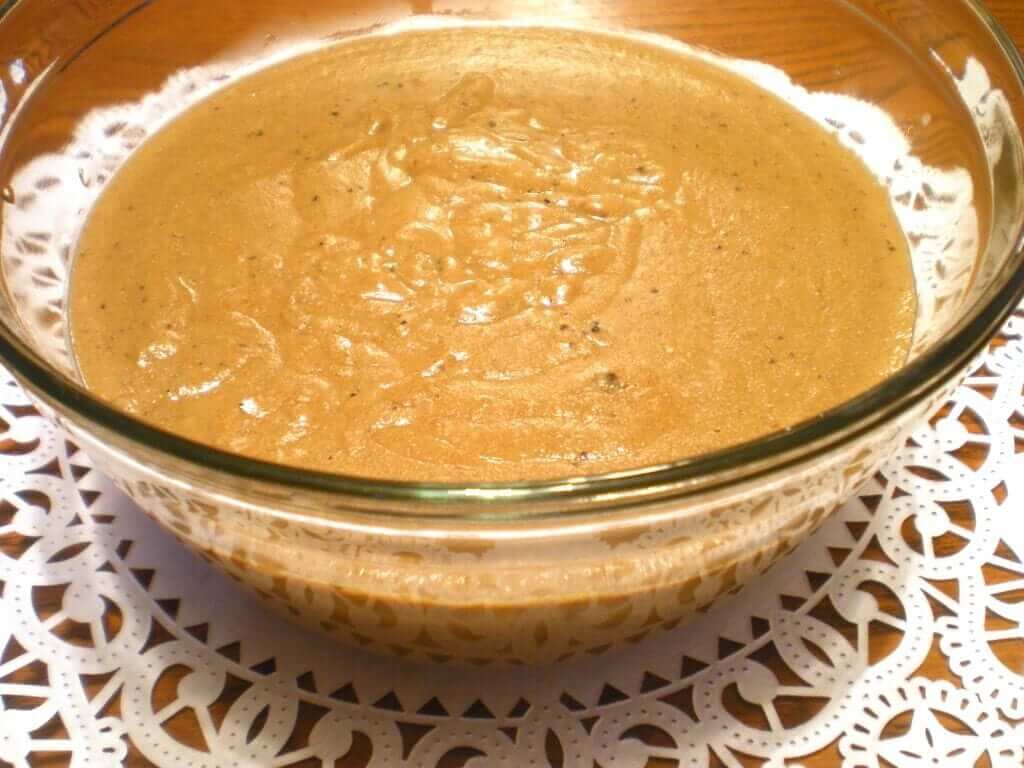 The liver pâté is blended with the other ingredients until smooth, creating a thin, brownish-orange sauce with a glossy sheen.
