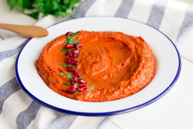 Muhammara is a spicy and nutty Middle Eastern dip made from roasted red peppers, walnuts, breadcrumbs, pomegranate molasses, and spices.