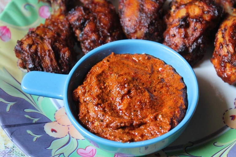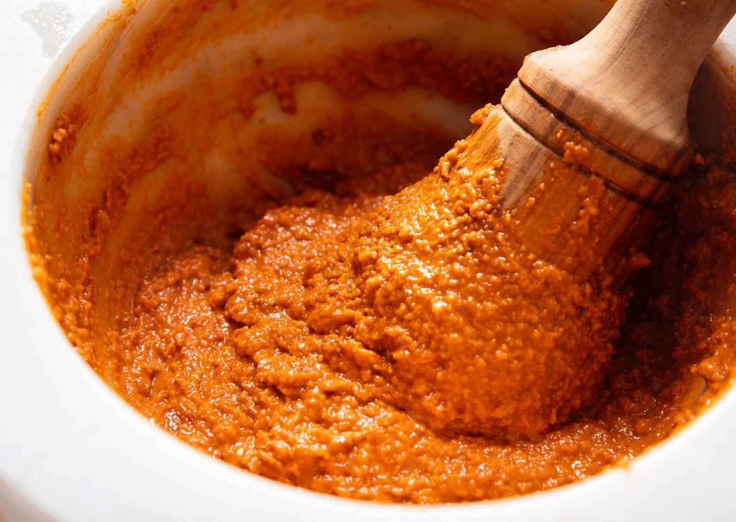 The chili peppers are toasted until fragrant, then ground into a coarse powder and mixed with garlic, nuts (usually peanuts or almonds), and oil to create a thick, chunky sauce.