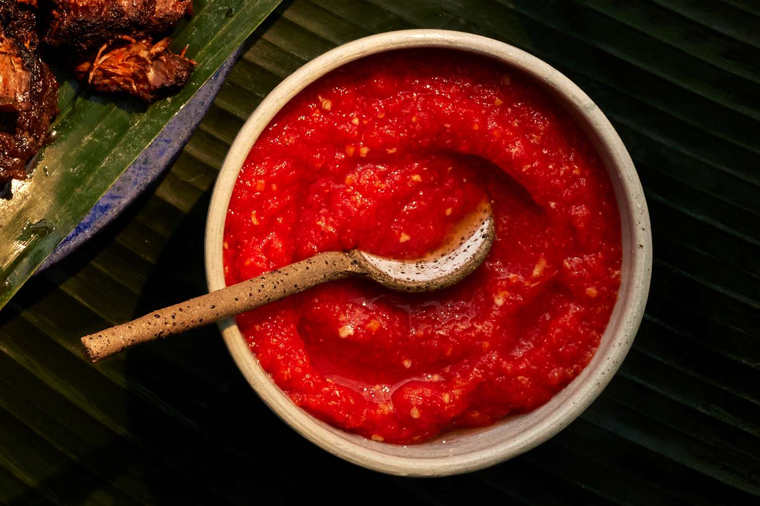 The chili peppers’ fiery heat is balanced by the shallots’ sweetness and the lime juice’s citrusy tang in sambal matah.