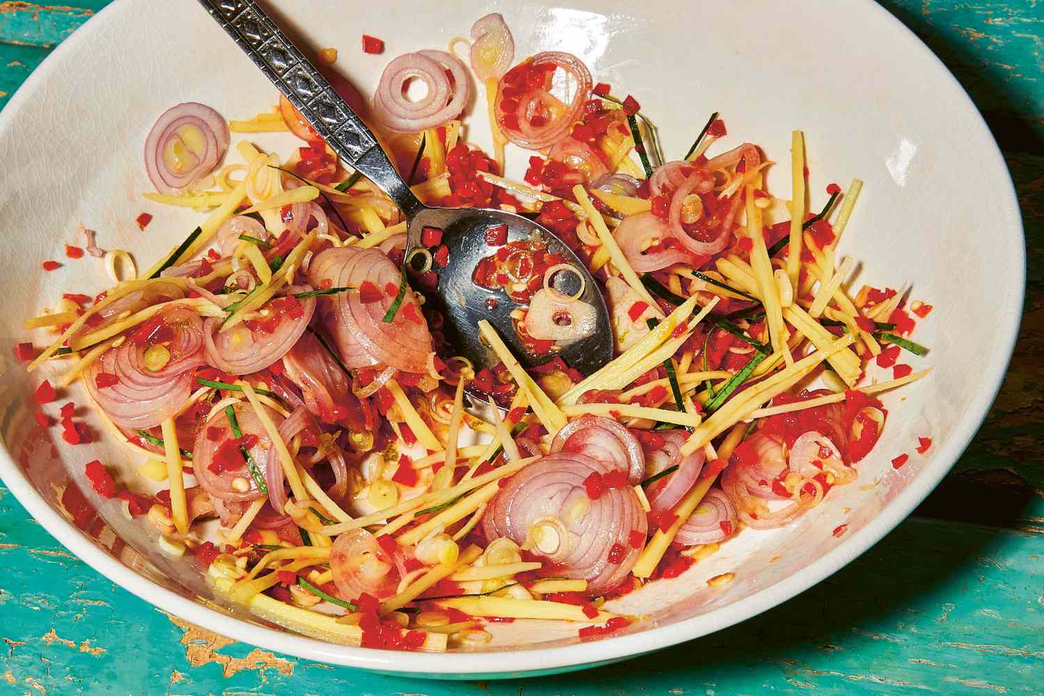 The ingredients are thinly sliced and mixed with coconut oil, creating a loose, oily, bright red and green sauce.