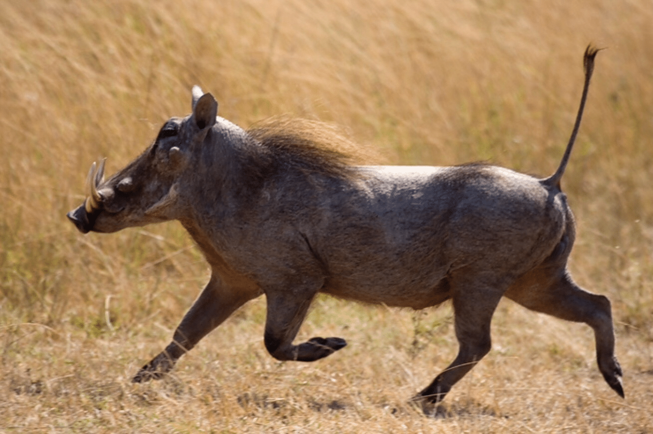 The Warthog has a dark gray body with sparse hair, distinctive facial warts, curved tusks, and a mane of long hair down its back.