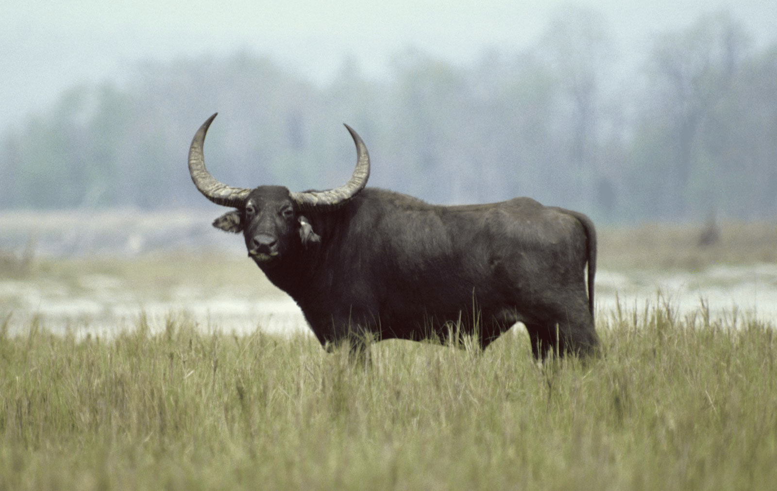 The Water Buffalo has a massive body with large curved horns, sparse coarse hair, and specialized splayed hooves for navigating muddy terrain.