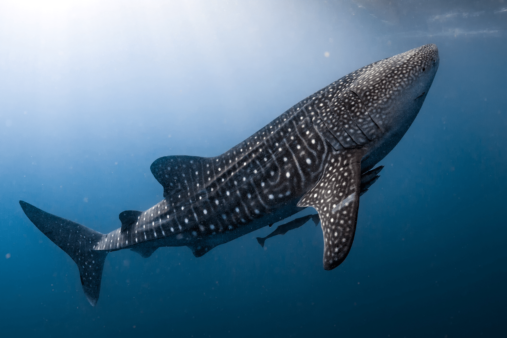 It filters plankton through specialized pads, can vertically dive to nearly 6,000 feet, and is the largest fish in the world.