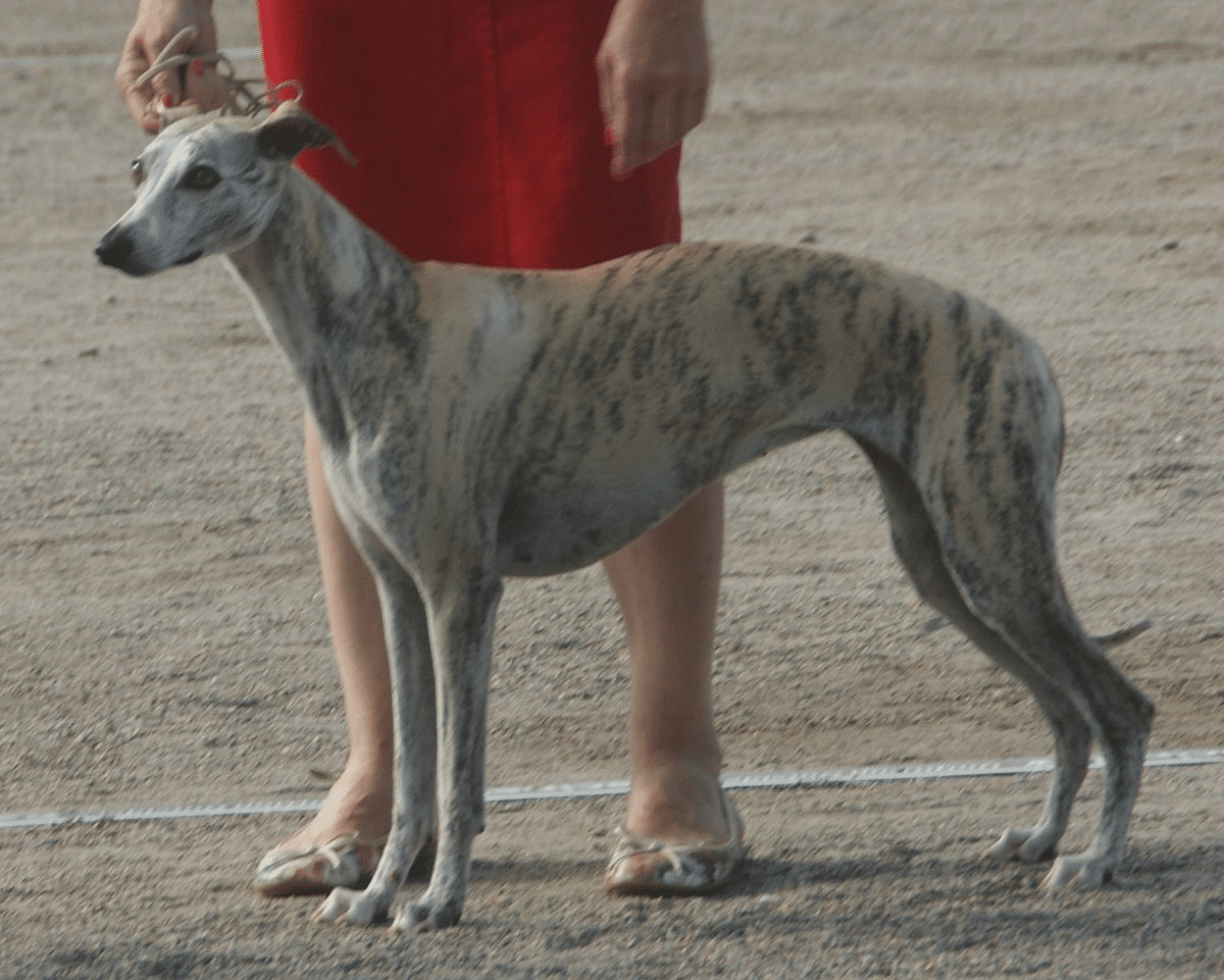 The Whippet has a slender, aerodynamic build with a narrow head, deep chest, and distinctive arched back when standing.