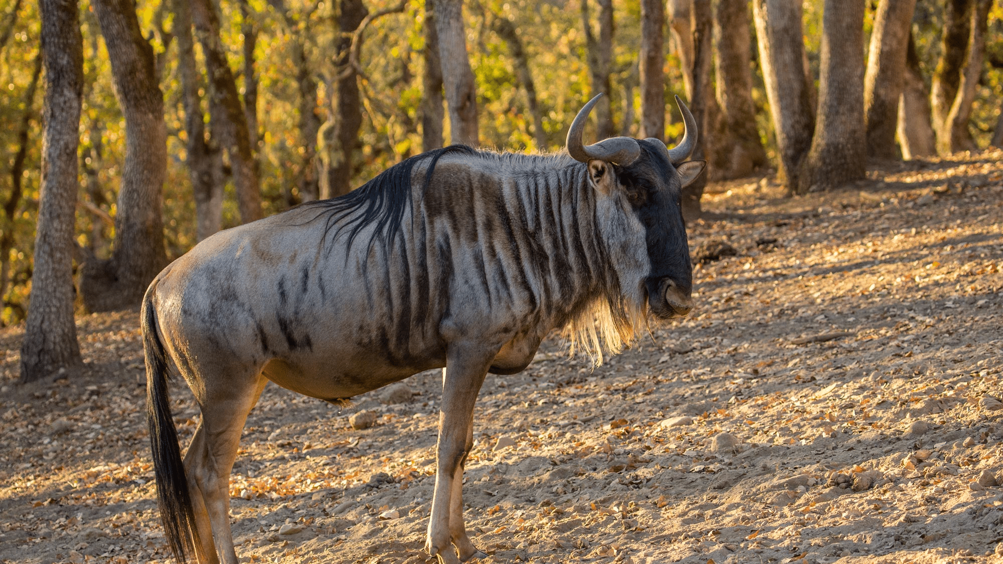 The Wildebeest has a bovine head, horse-like mane and tail, and curved horns present in both sexes.