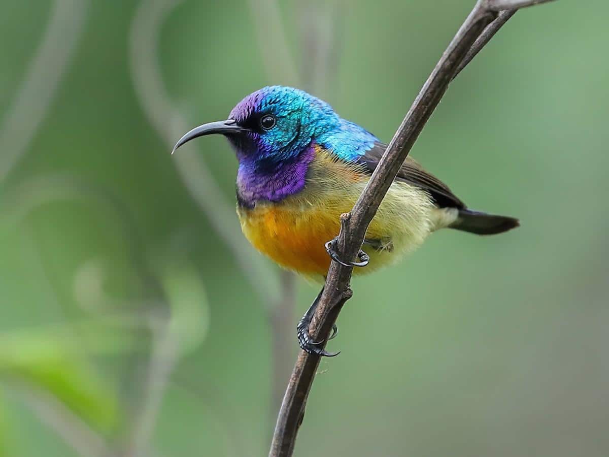 Van Hasselt’s Sunbird has iridescent metallic blue-black plumage in males with a bright red chest patch, while females are olive-green.