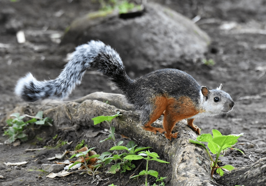 The Variegated Squirrel has multicolored fur in combinations of gray, brown, black, and white, and it has a long, bushy tail for balance.