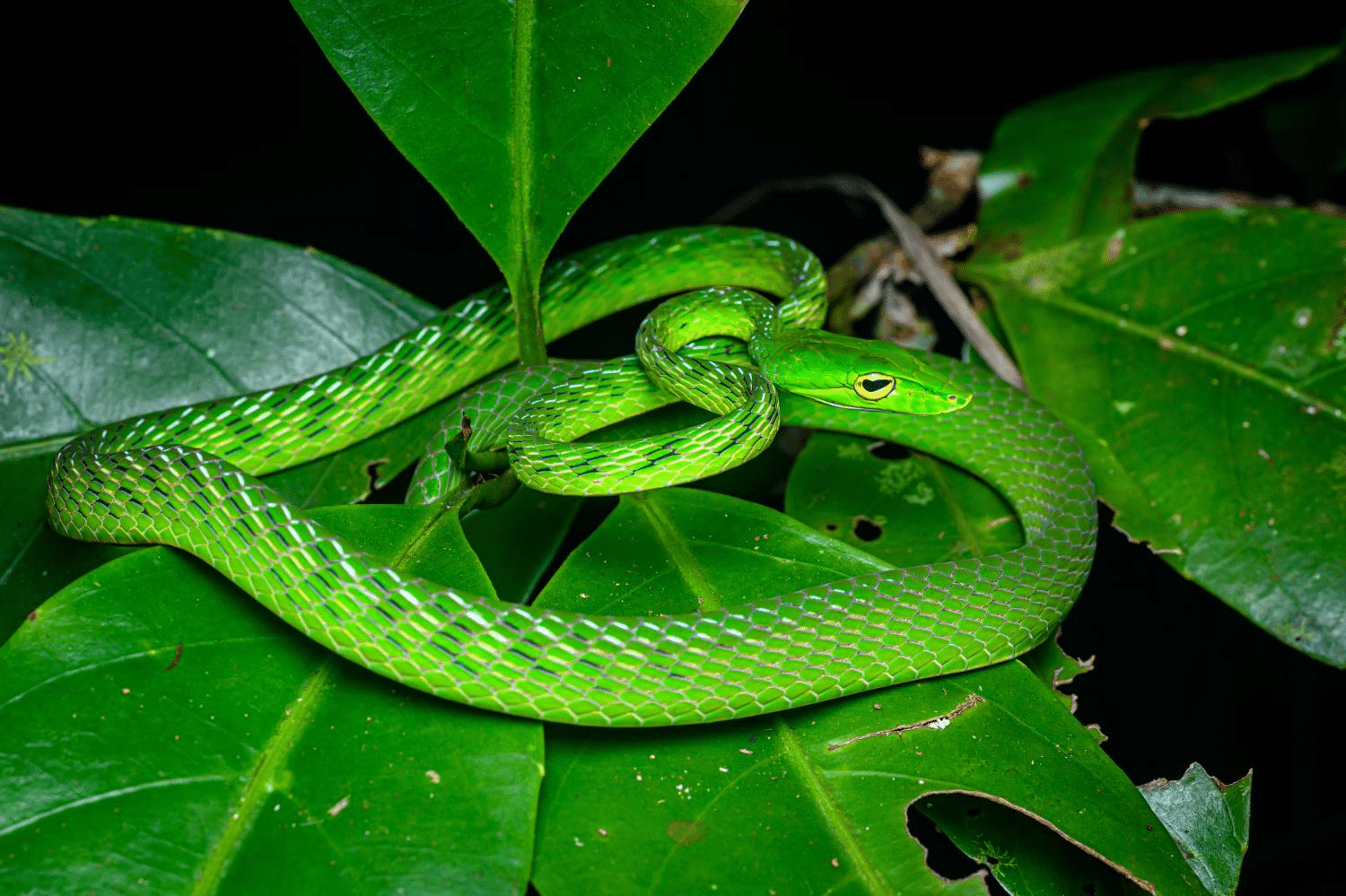 The Vine Snake has an extremely slender body, pointed head, and horizontal pupil in a large, almond-shaped eye.