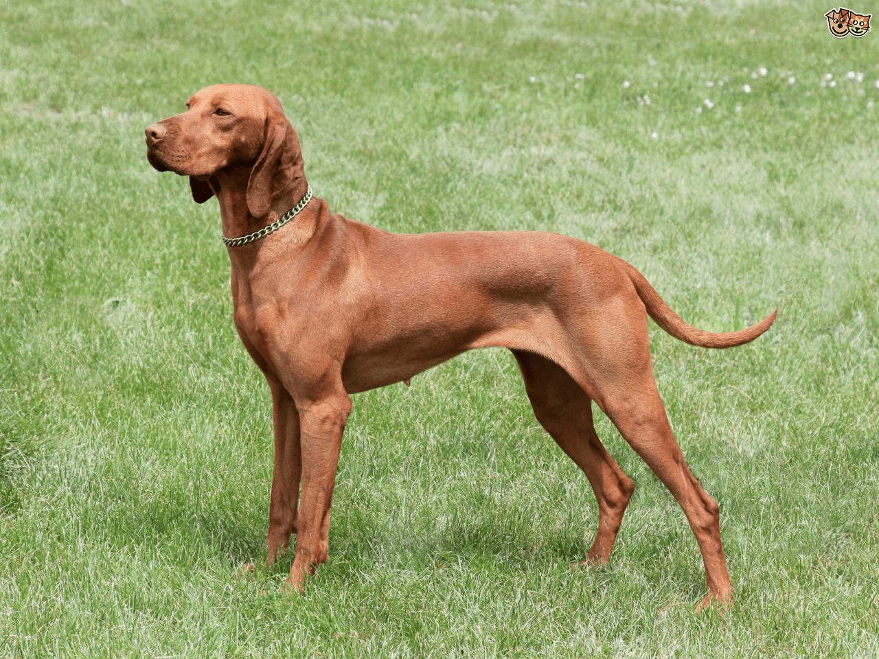 The Vizsla has a lean, muscular body, distinctive golden-rust coat, and sleek appearance with a noble bearing.