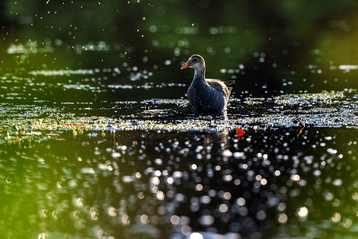 It has long toes for walking on floating vegetation and short, rounded wings reflecting its limited flying abilities.