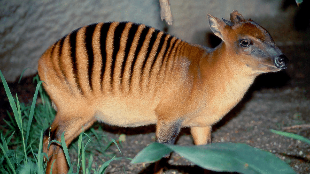 The Zebra Duiker is a small antelope with a rich chestnut coat marked by distinctive black stripes across its back, and short, straight horns on both males and females.