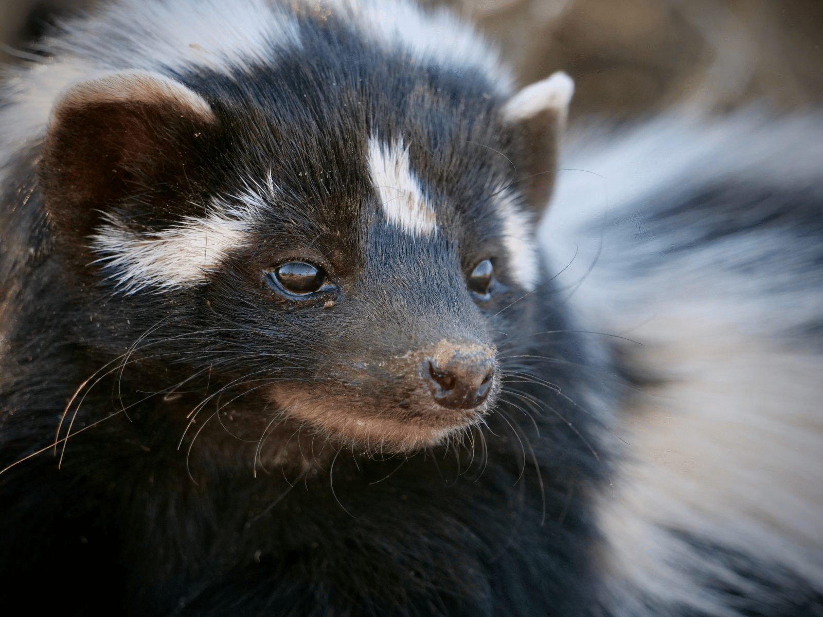 The Zorilla resembles a skunk with black fur featuring distinctive white stripes from head to tail and a bushy, white-tipped tail.