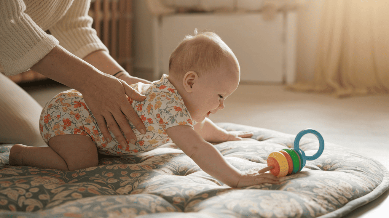 Behavior changes can also signal readiness. Your baby might rock from side to side during play, accidentally roll partway over, or show frustration as they try to reach toys just out of reach. They might also begin twisting their body, turning their hips, or kicking their legs with more purpose.