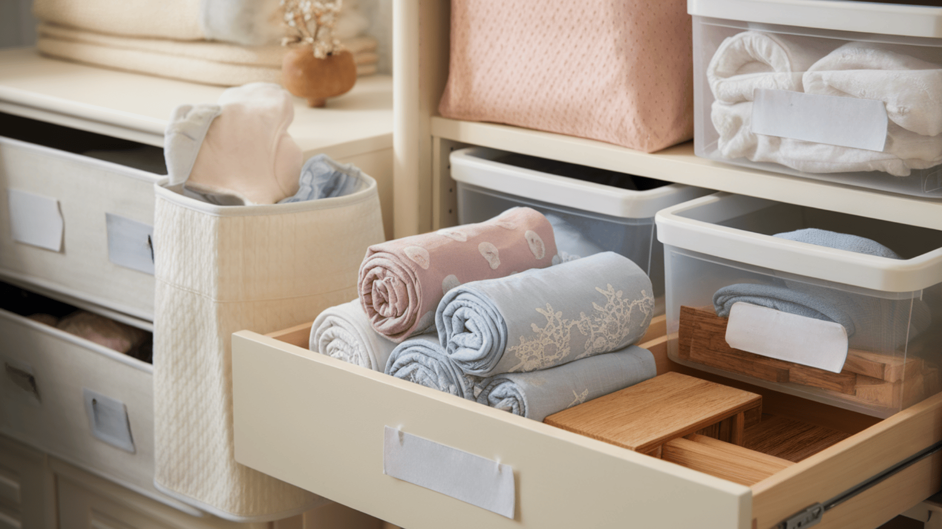 Organize baby clothes by size and type in labeled bins, drawers, or closet dividers to quickly find what you need during hectic days. Rolling onesies instead of folding saves space and reduces wrinkles.
