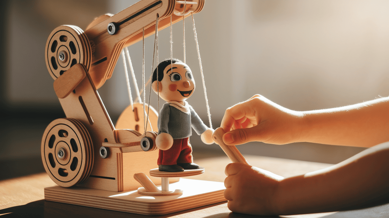 Build a mechanical system with pulleys, levers, or cranks to lift and control puppet movements without electricity.