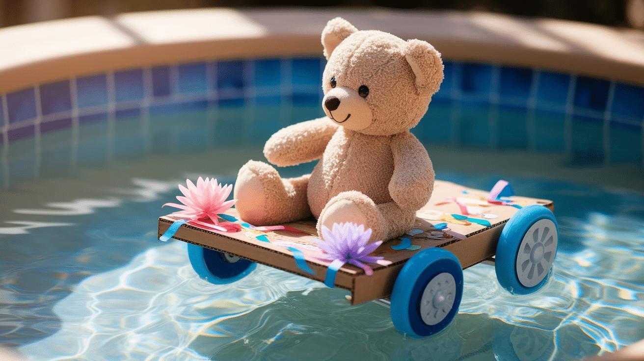 Construct a small-scale float that can carry a stuffed animal using wheels, decorations, and a pulling mechanism.