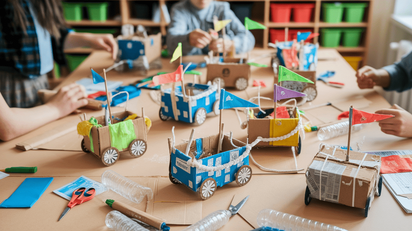 Use a string to create moving parts like flags or wheels. Students learn upcycling and develop engineering skills.