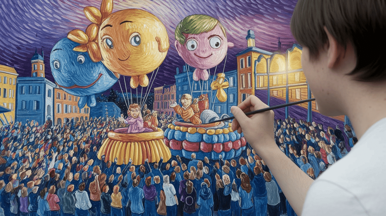 Create a parade painting inspired by artists like Van Gogh’s swirling style, Picasso’s cubism, or Warhol’s pop art.