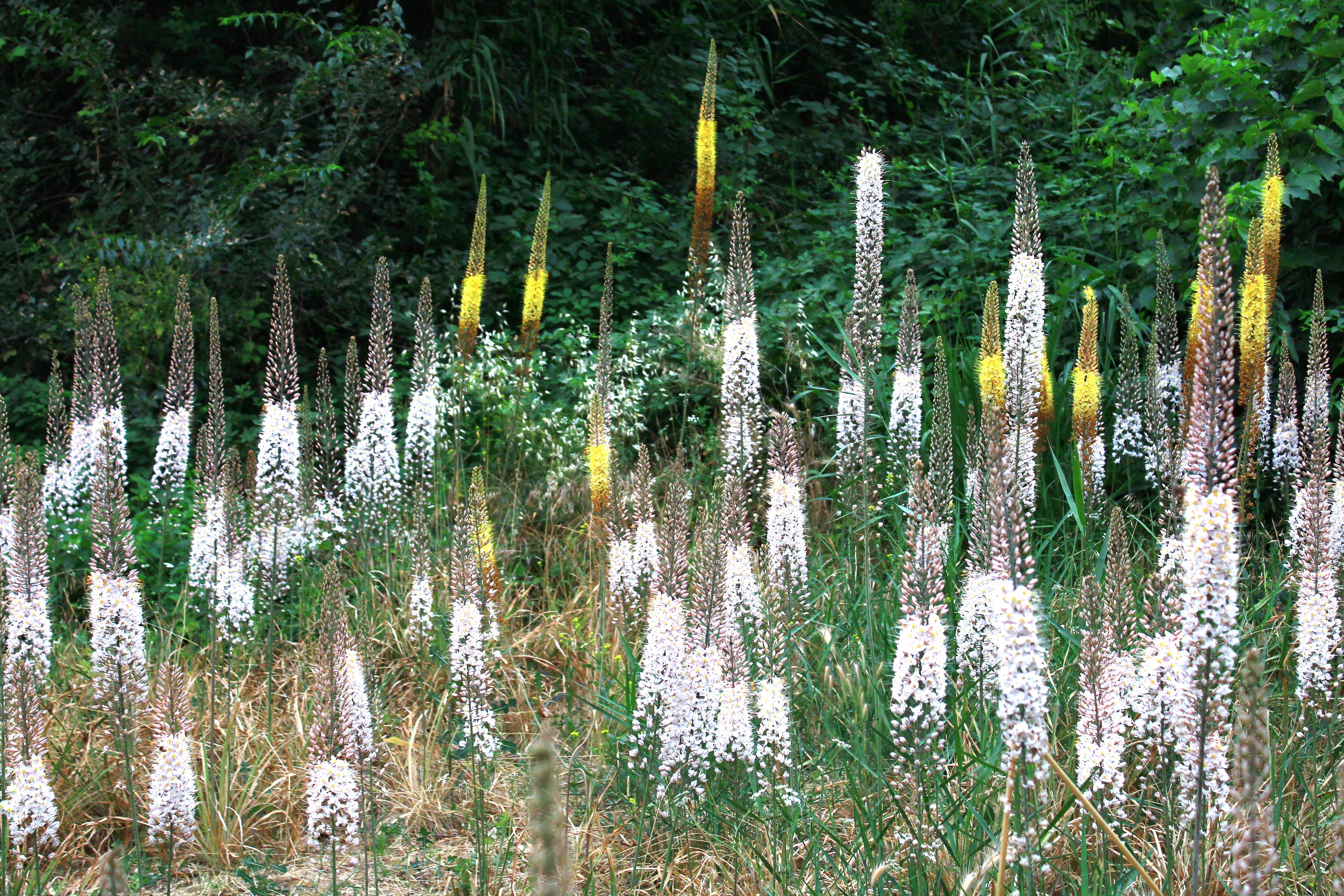 Eremurus robustus, another species of Foxtail Lily, features tall, spire-like clusters of pale pink or white flowers.