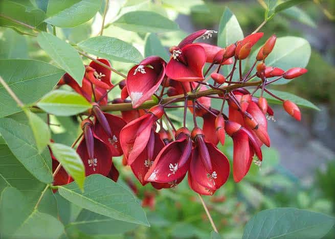 Erythrina, or Coral Tree, is known for its bright red, coral-like flowers and thorny branches.