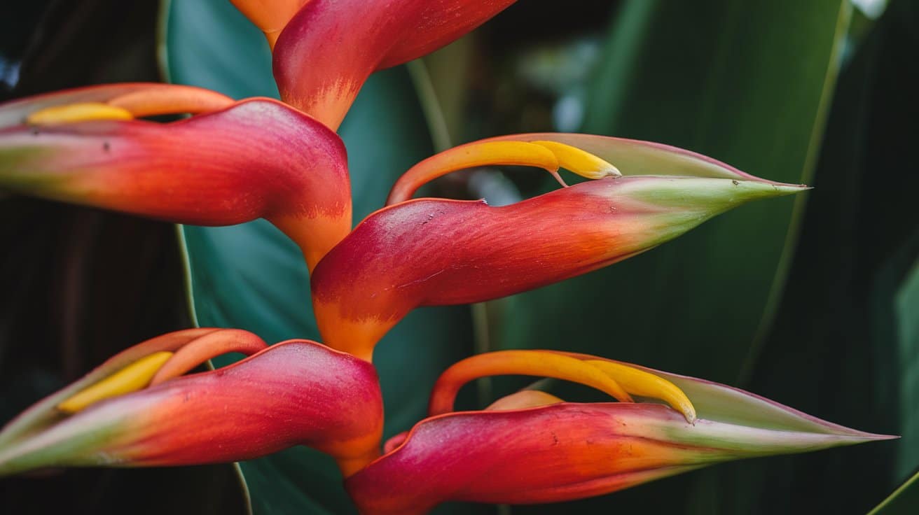 Heliconia, often known as Lobster Claw due to its distinctive shape, features bright red, orange, or yellow bracts with small flowers hidden inside.