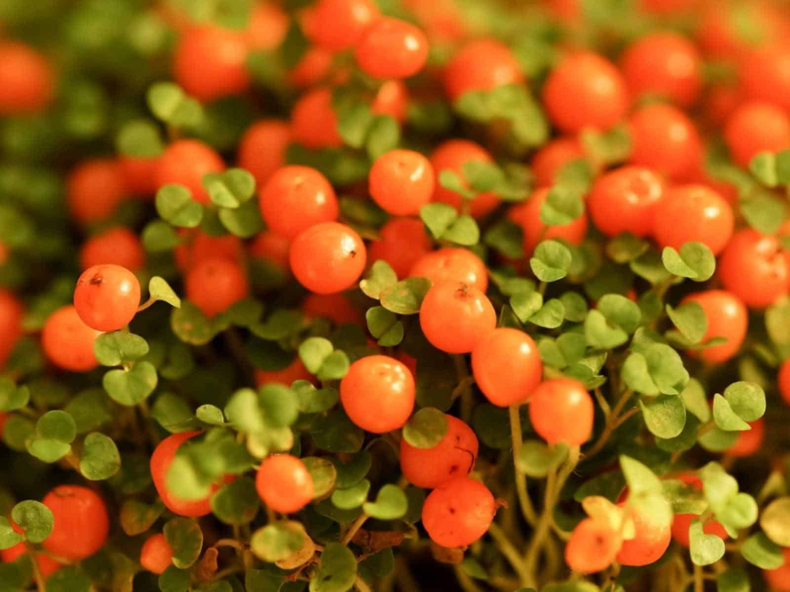 Nertera, also known as Bead Plant, is a small, creeping perennial known for its bright orange, berry-like fruits that resemble beads.