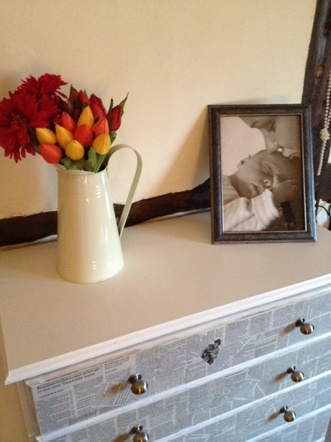 The 90s pine was rubbed down, painted and decoupaged and is accessorised with a Dunelm Mill jug (£5.99) with a selection of fabric flowers. The (self-proclaimed) Northern Love Machine banned real flowers on account of his hayfever.