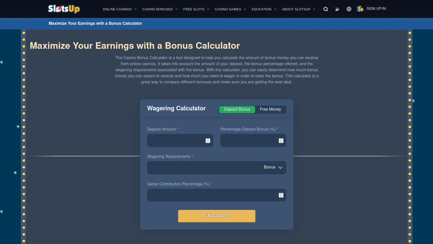- Examines wagering requirements. The SlotsUp team checks the transparency of casino bonuses and provides a verdict on how likely it is to wager it back for a regular player.