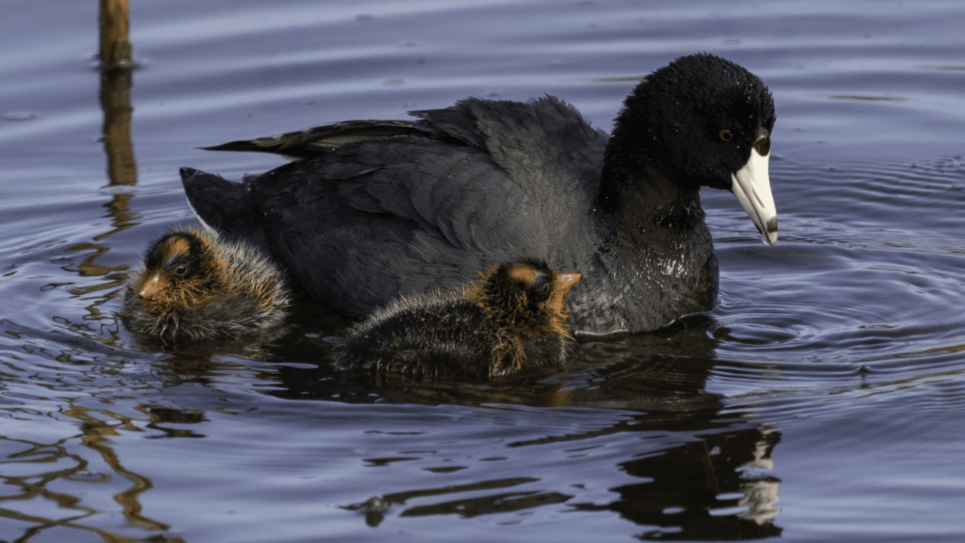 Often mistaken for a duck, this dark gray bird has a white bill and forehead shield. It measures 13 to 17 inches and has lobed, not webbed, feet for walking on land and swimming.