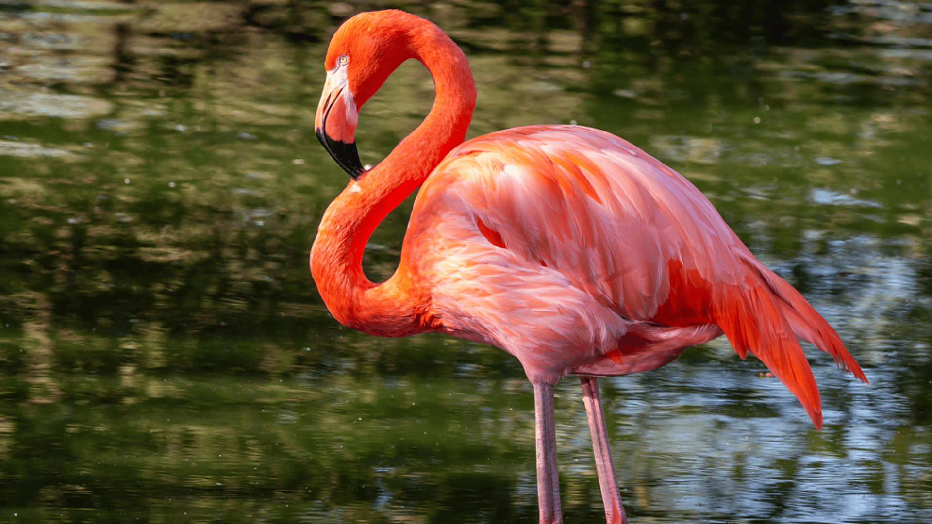 This tall, wading bird can reach 5 feet tall. It has striking pink plumage, long legs, and a unique down-curved bill adapted for filter-feeding in shallow waters.