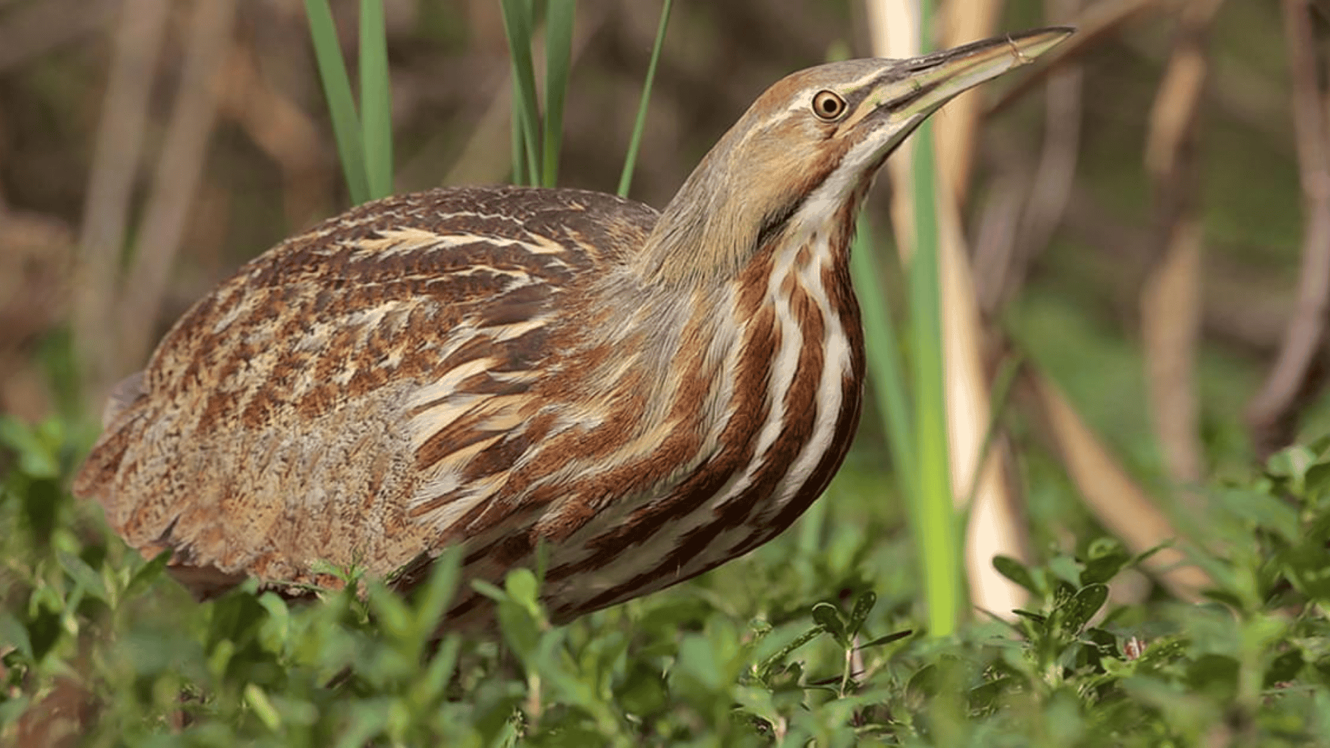 A medium-sized heron, about 23 to 34 inches long, with a streaky brown body perfect for camouflage in reeds.