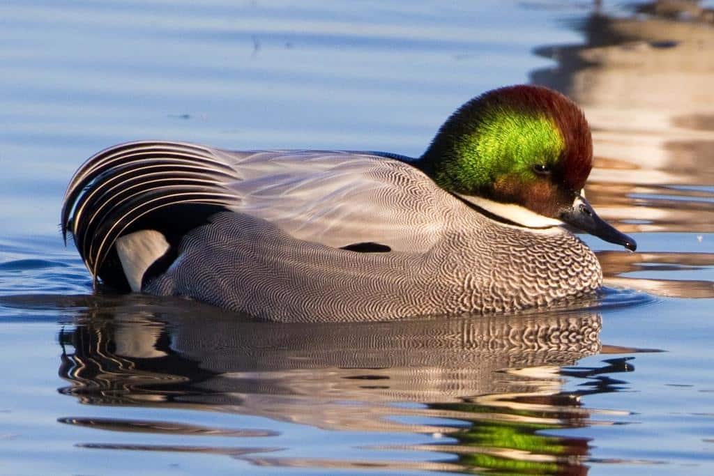 The Falcated Duck features a metallic green head and long curved tertial feathers. It is a dabbling duck and prefers shallow wetlands and marshes. Its graceful plumage makes it stand out among waterfowl.