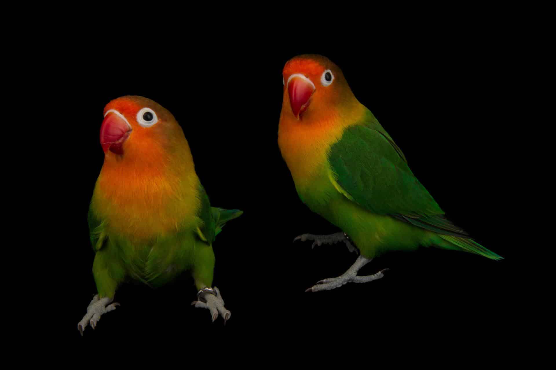 Fischer’s Lovebird is a small parrot with green plumage, an orange head, and a white eye ring. It is social and often seen in noisy flocks. These birds form strong pair bonds and are popular as pets.