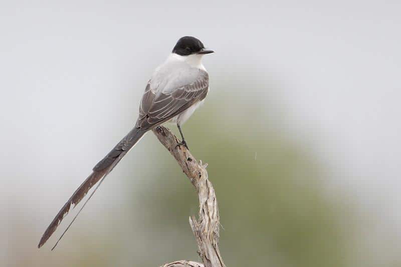 The Fork-tailed Flycatcher is known for its long, elegant tail and agile flight. Its plumage is mostly white with a black cap and gray back. It performs aerial acrobatics to catch flying insects mid-air.