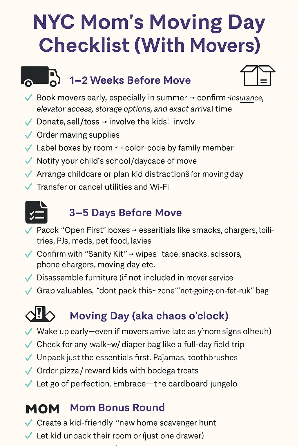 Whether you’re upgrading from a one-bedroom in Astoria to a brownstone in Brooklyn (hello, exposed brick!) or just shifting a few blocks to get closer to your kid’s school, here’s the no-fluff, mom-approved guide to surviving NYC moving day without spiraling.