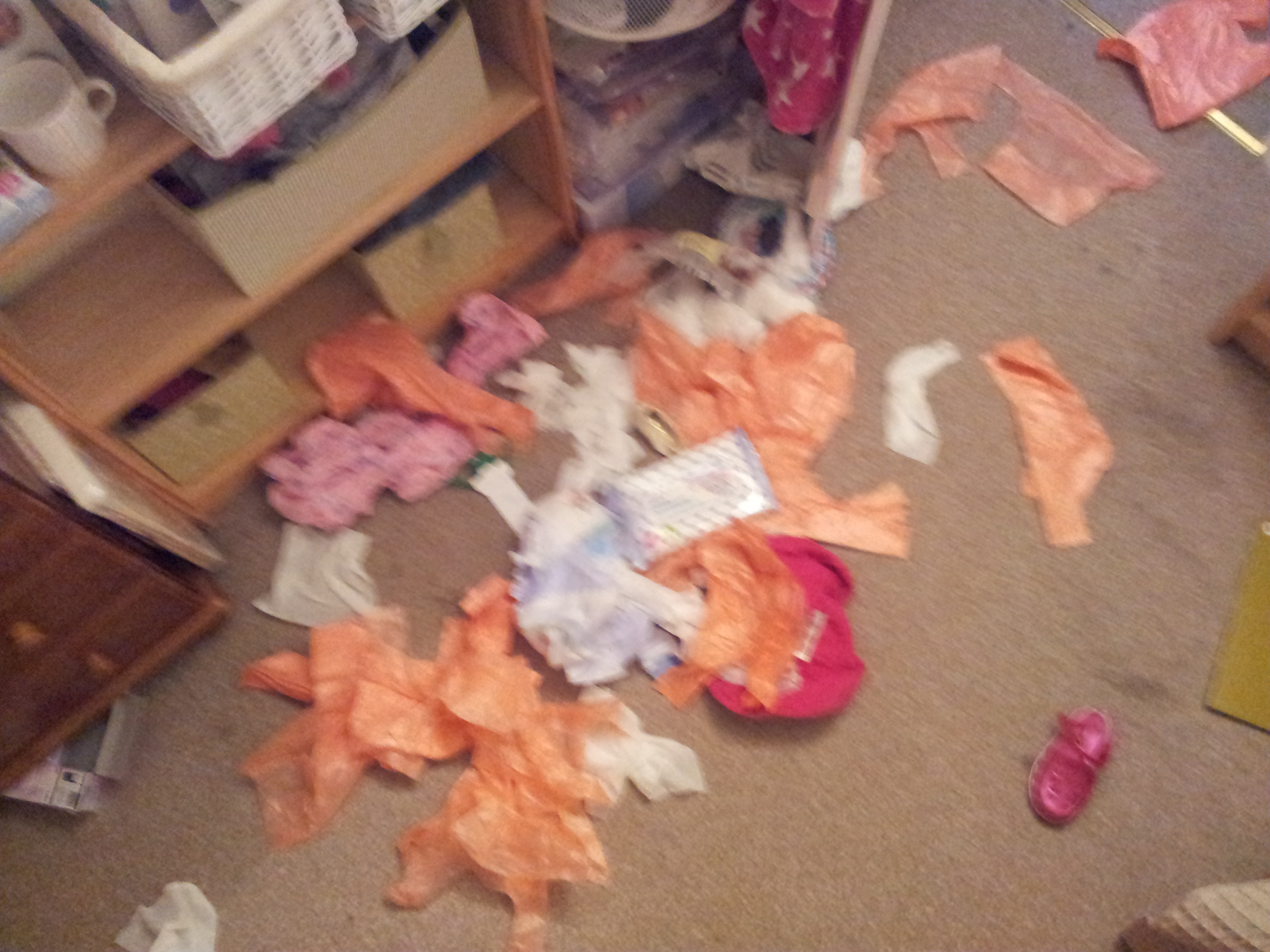 Seriously – make the most of it Emma! We found F last night with her pyjama bottoms on her head and ten pairs of socks on each foot, underneath some jelly shoes, pretending to be asleep under the covers. MAKE IT STOP!!!