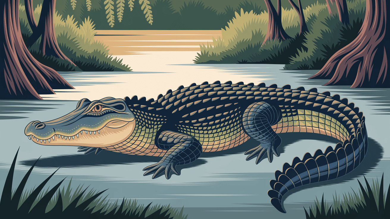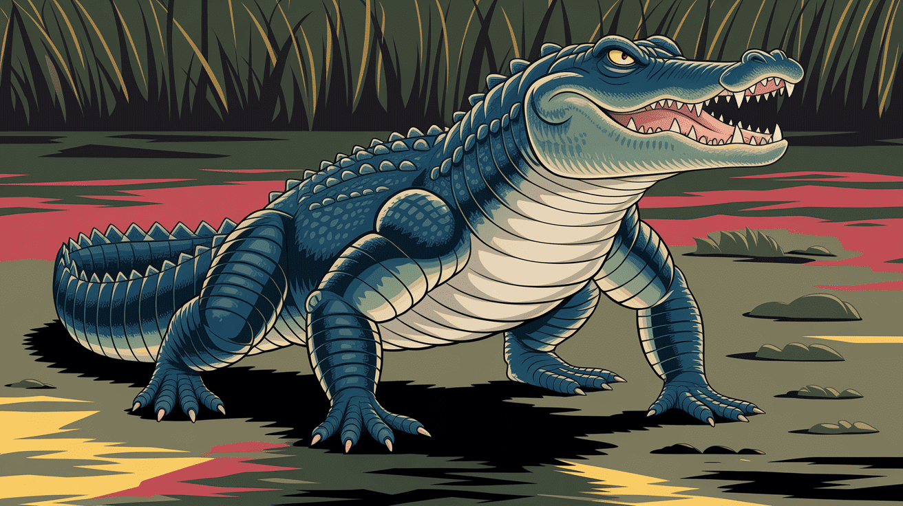 Reference: An ominous and foreboding alligator, like a sinister presence.