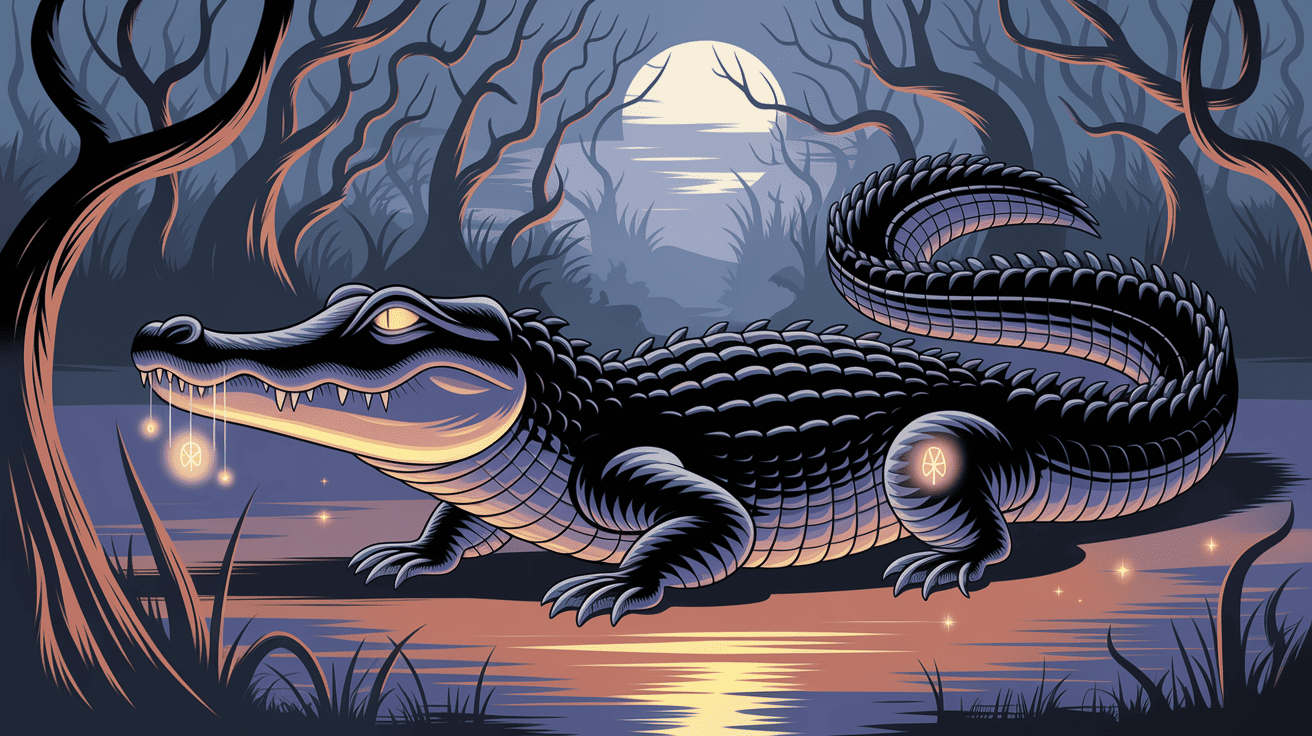 Reference: A dark and mysterious alligator, like a shadow cast by a witch.