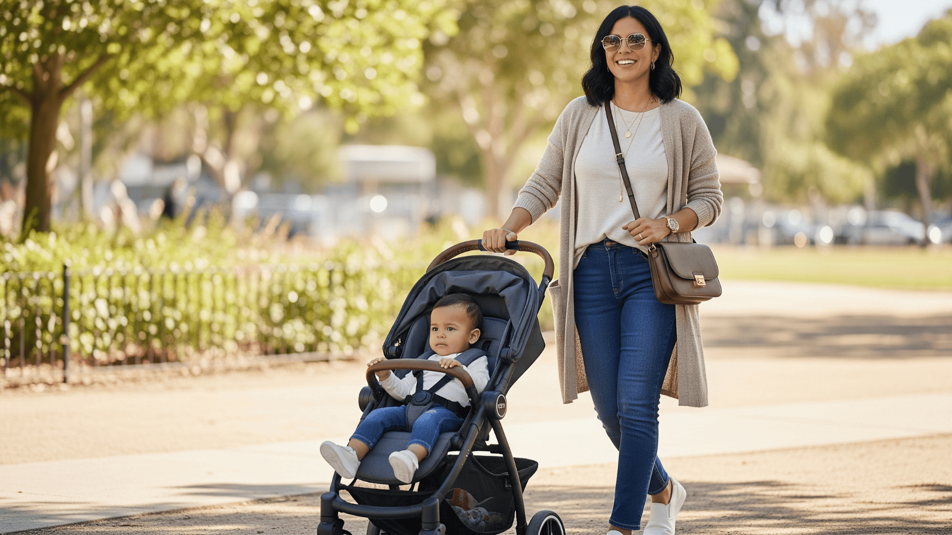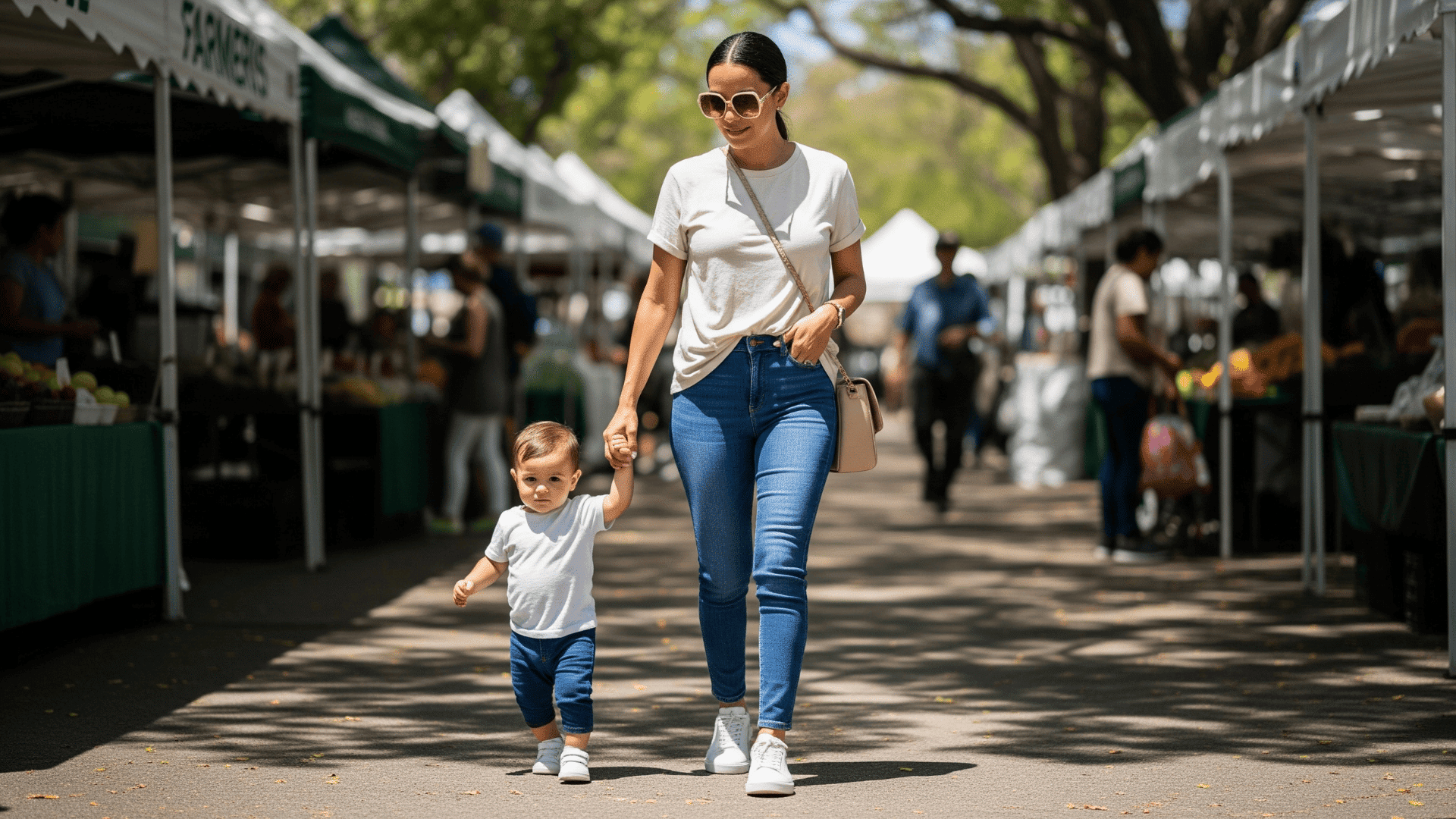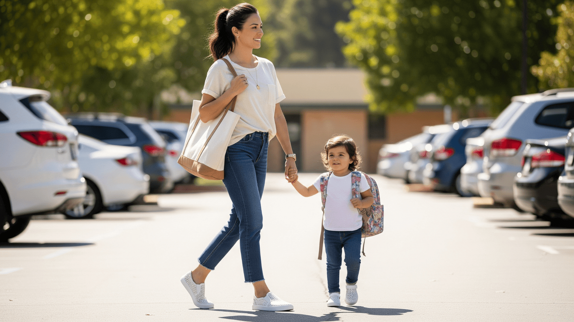 This style works perfectly for school drop-offs, casual errands, and active family outings while maintaining a polished appearance.