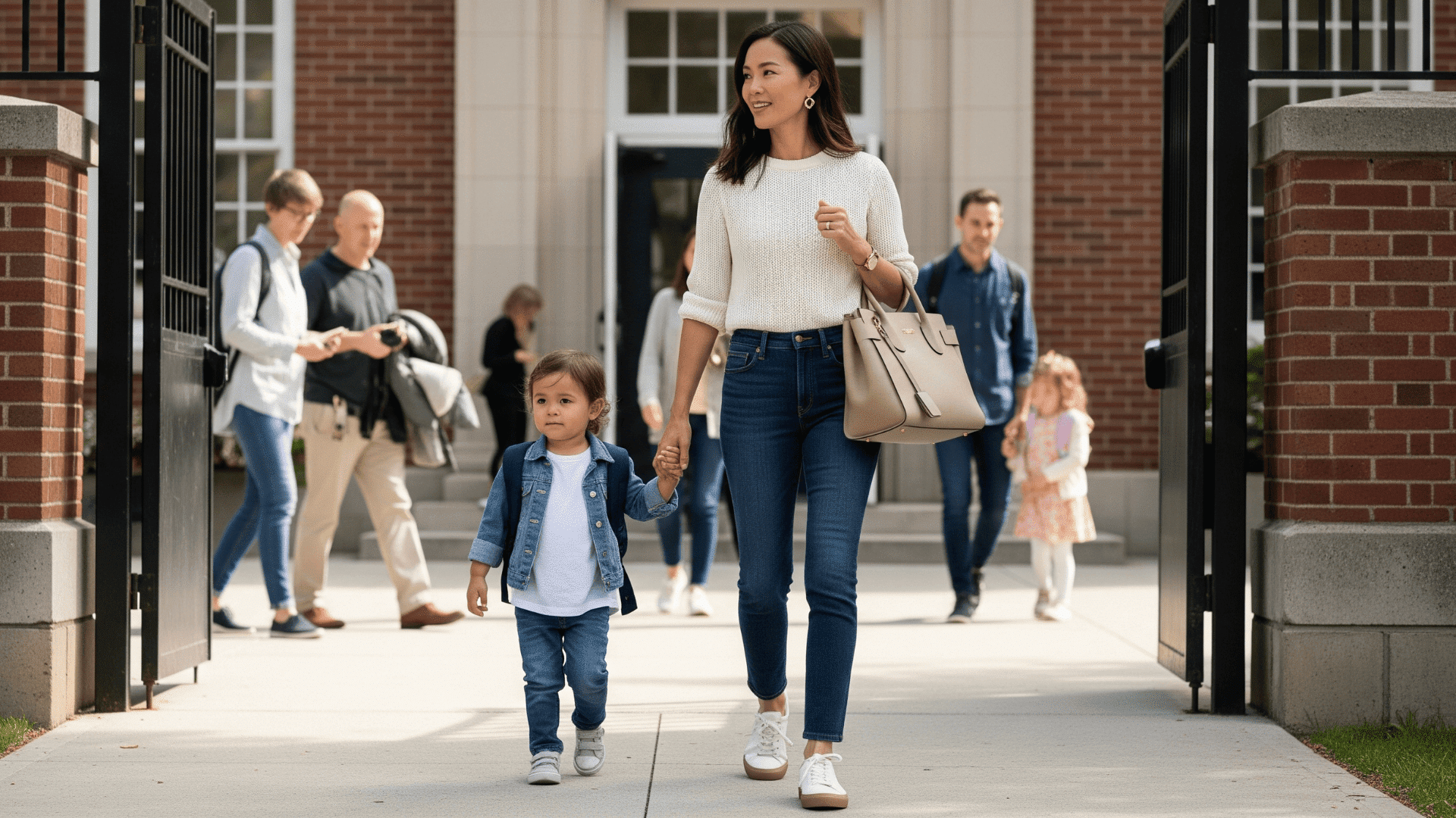 School drop-off is your moment to look put-together for those brief teacher chats and parent hellos.