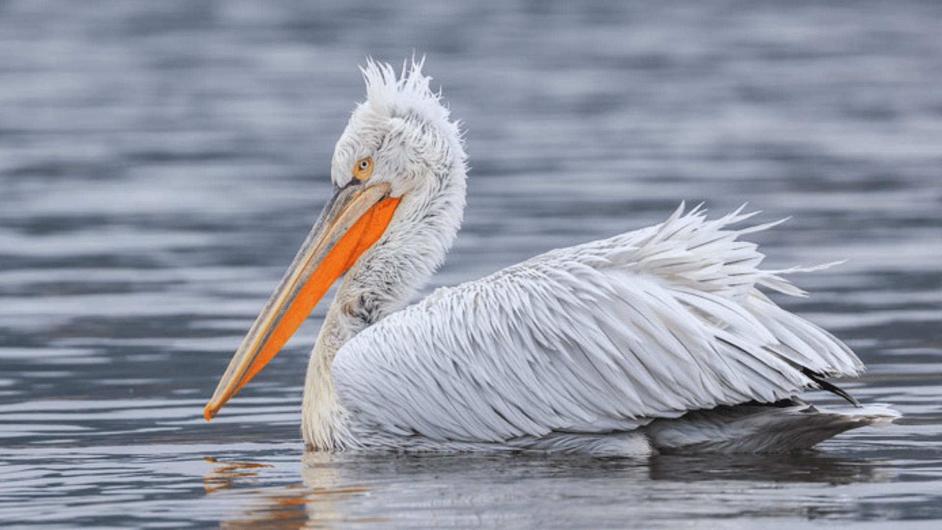 The Dalmatian Pelican is one of the largest freshwater birds, measuring around 160–183 cm in length with a wingspan of up to 3.5 meters. It has silvery-white plumage, a curly nape crest, and a massive orange-red pouch during breeding season.