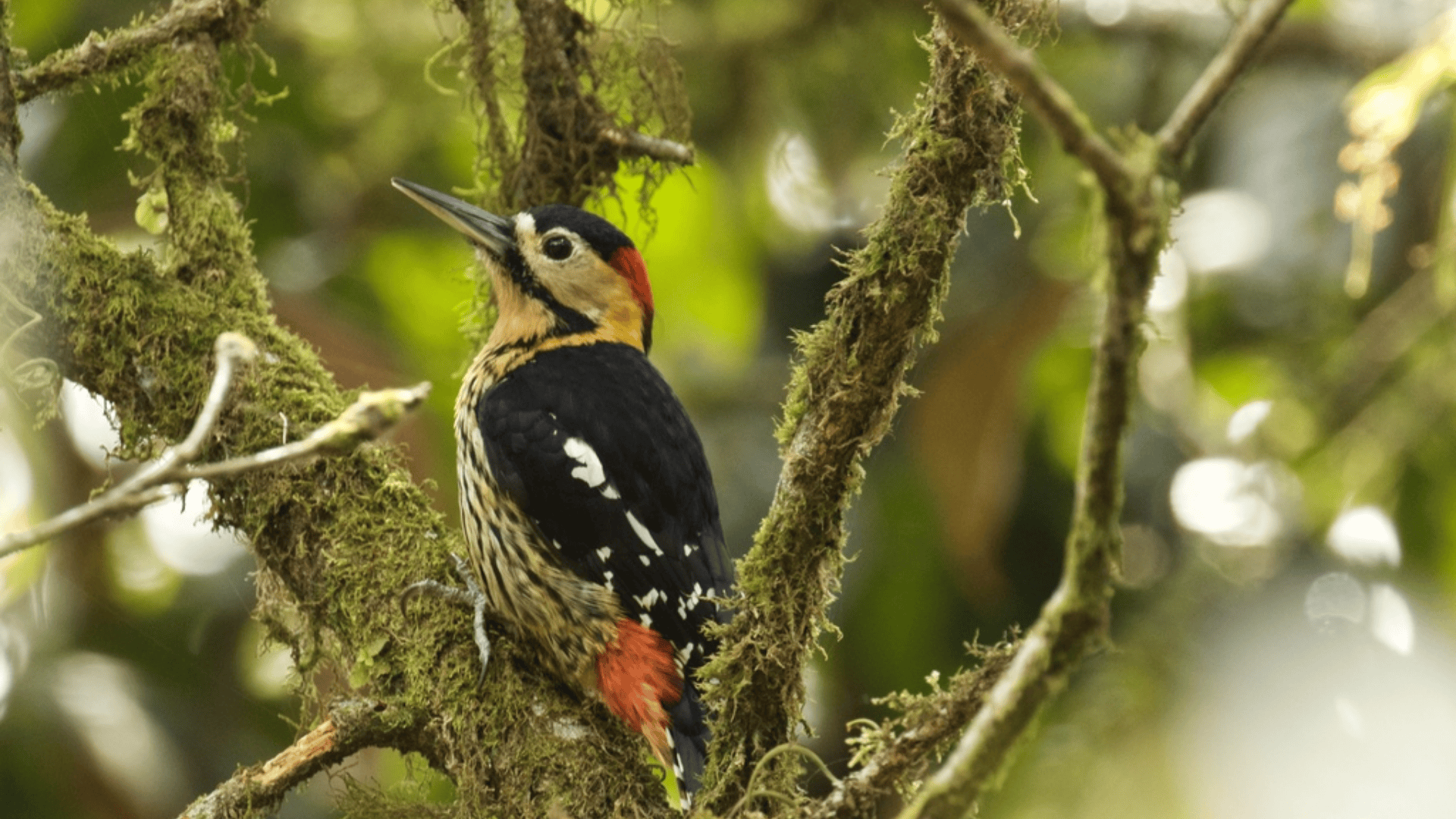 This medium-sized woodpecker has black and white plumage with a red crown in males. It’s about 20–23 cm long and often seen scaling tree trunks in Himalayan forests.