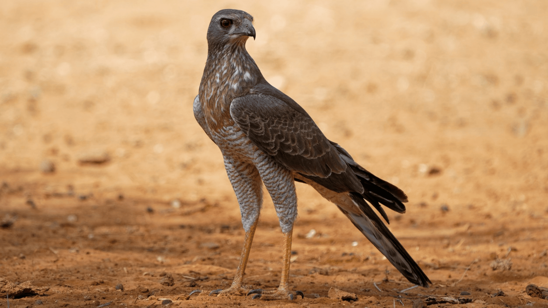 This striking raptor has a grey head and chest, orange-red legs and cere, and black-tipped wings. It reaches about 55–65 cm in length.